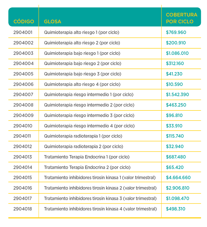 El valor de los esquemas corresponde a un ciclo. Sólo en el caso de tratamientos con inhibidores de tirosin kinasa el valor es trimestral. El valor de los esquemas se actualizará conforme lo haga el arancel FONASA respectivo. La cantidad de ciclos necesarios para el tratamiento se determinará por el médico tratante.